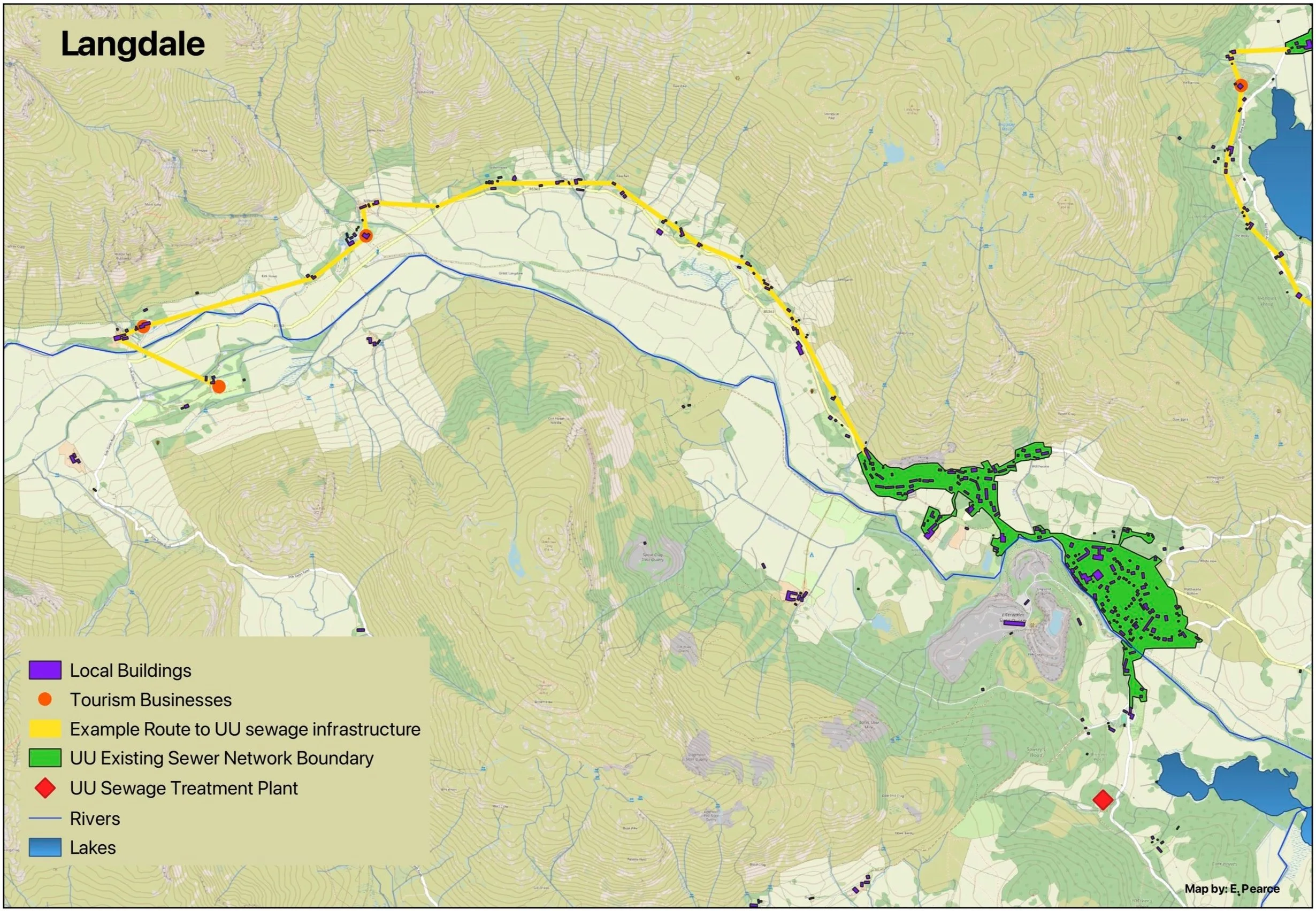 The most significant environmental impact in this area originates from National Trust businesses located at the head of Langdale Valley. This presents a unique opportunity for intervention, as the primary locality suitable for mains connection lies at the head of the valley, while 99% of additional properties are situated along the suggested route for a new main sewer. The beck ultimately flows into Elterwater, which is a Site of Special Scientific Interest (SSSI).